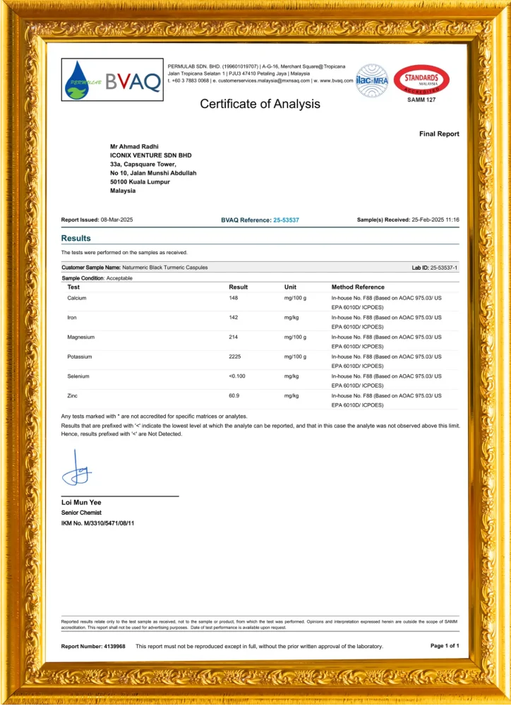 Ujian ini bukan sahaja menuntut tahap ketepatan yang tinggi, malah hanya makmal bertaraf antarabangsa seperti SGS Taiwan yang diiktiraf mampu menjalankannya. Ia menjadi bukti komitmen Naturmeric terhadap kualiti, ketelusan dan kredibiliti saintifik.