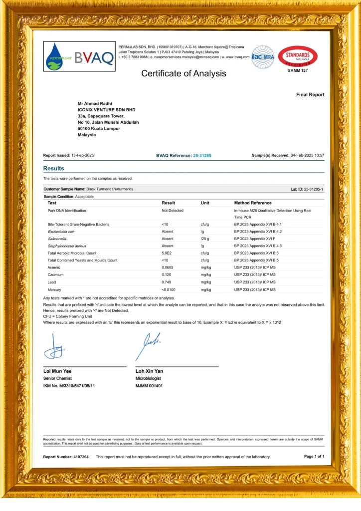 Produk Naturmeric yang sedang kami bangunkan ini telah disahkan 100 peratus mengandungi kunyit hitam tulen oleh Universiti Putra Malaysia.