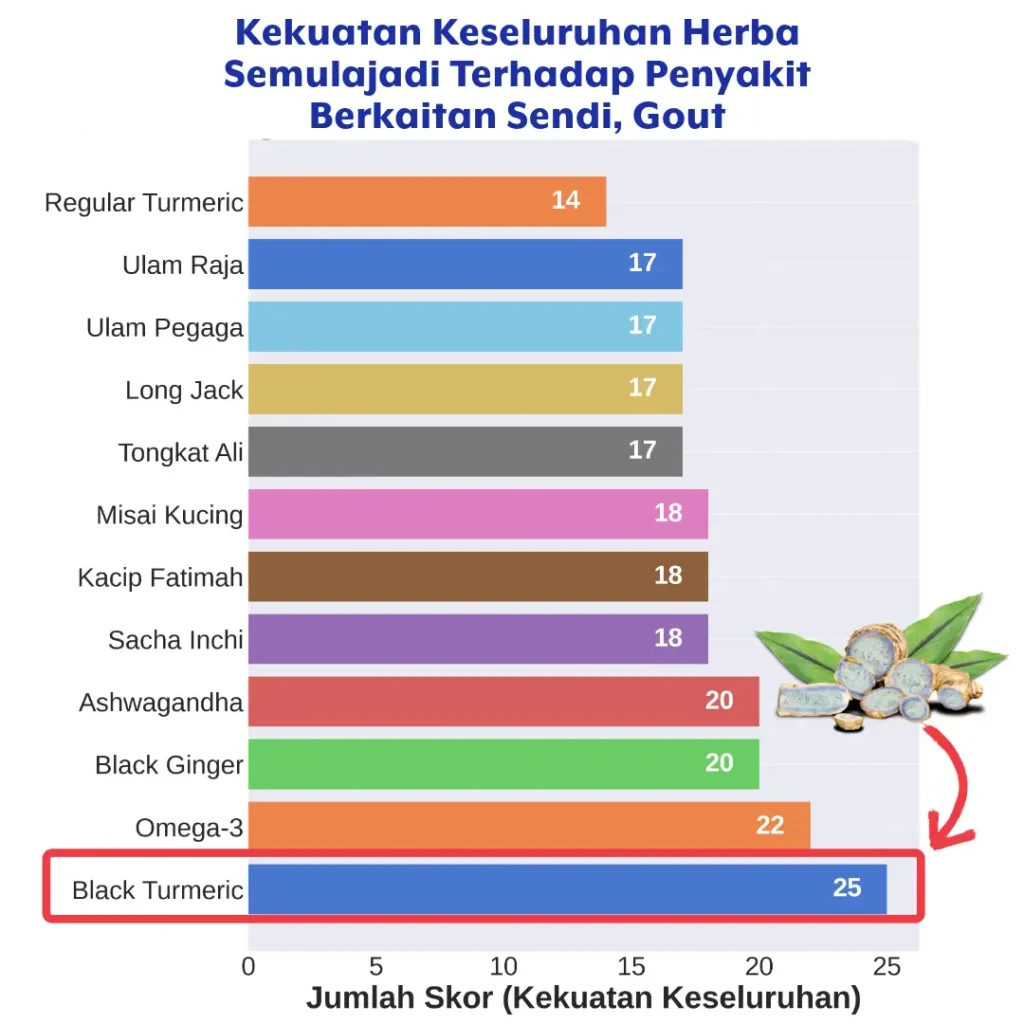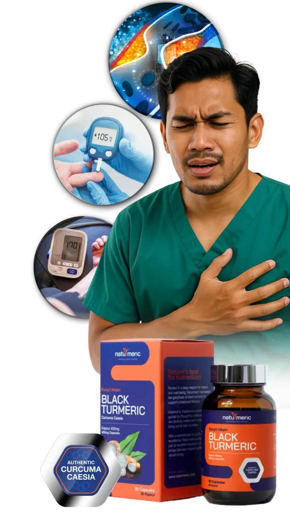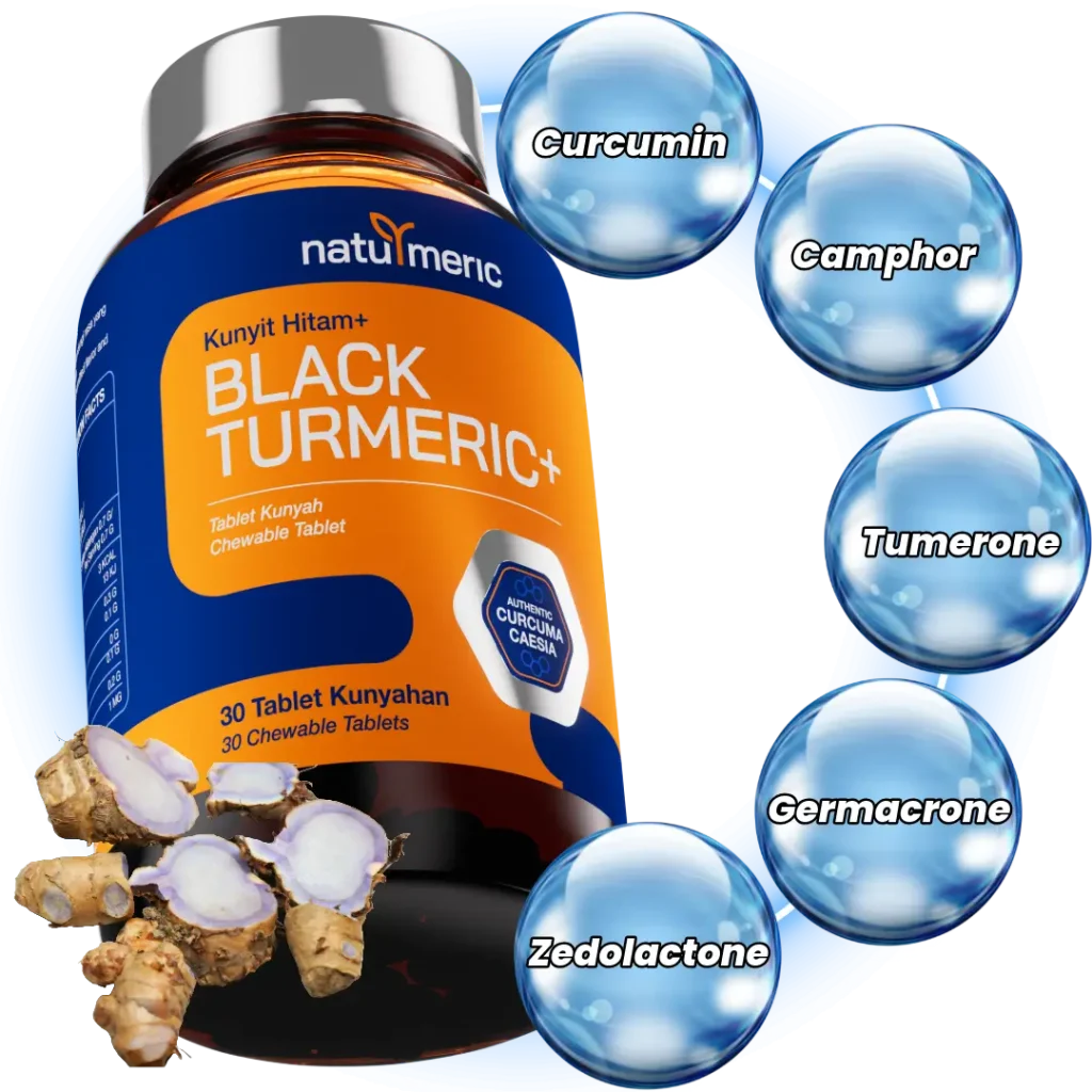Kunyit Hitam dalam NATURMERIC mengandungi sehingga 10 kali ganda lebih curcuminoid berbanding kunyit biasa — menjadikannya jauh lebih berkesan dalam melawan keradangan kronik, menstabilkan sistem imun, serta membantu menurunkan kesakitan dan paras asid urik secara semulajadi.